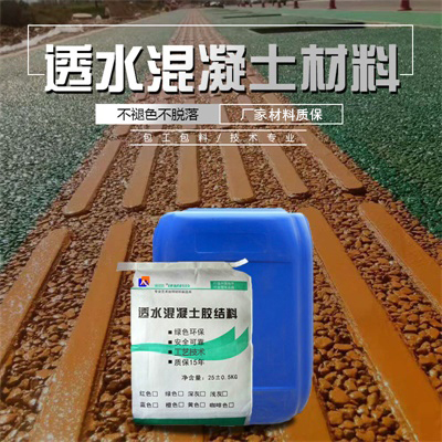透水混凝土胶结料是以高强度硅酸盐水泥为基料,配以多种助剂增加强度与粘结力组成的粉状料,并可按用户要求加入无机耐磨颜料,使其和碎石、水按照一定比例混合后,组成不同色彩的水混凝土面层。